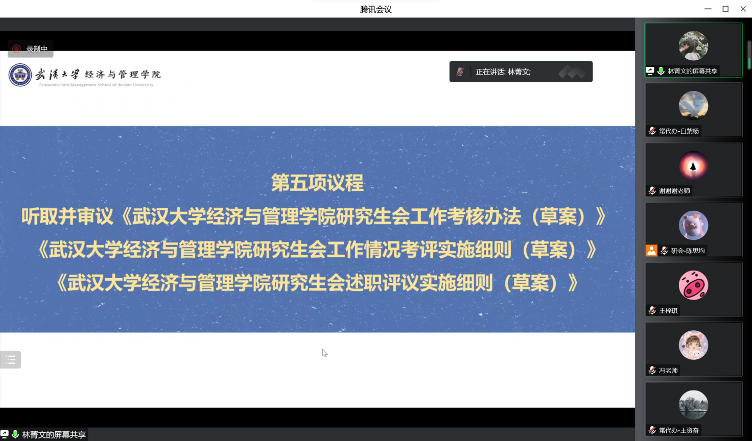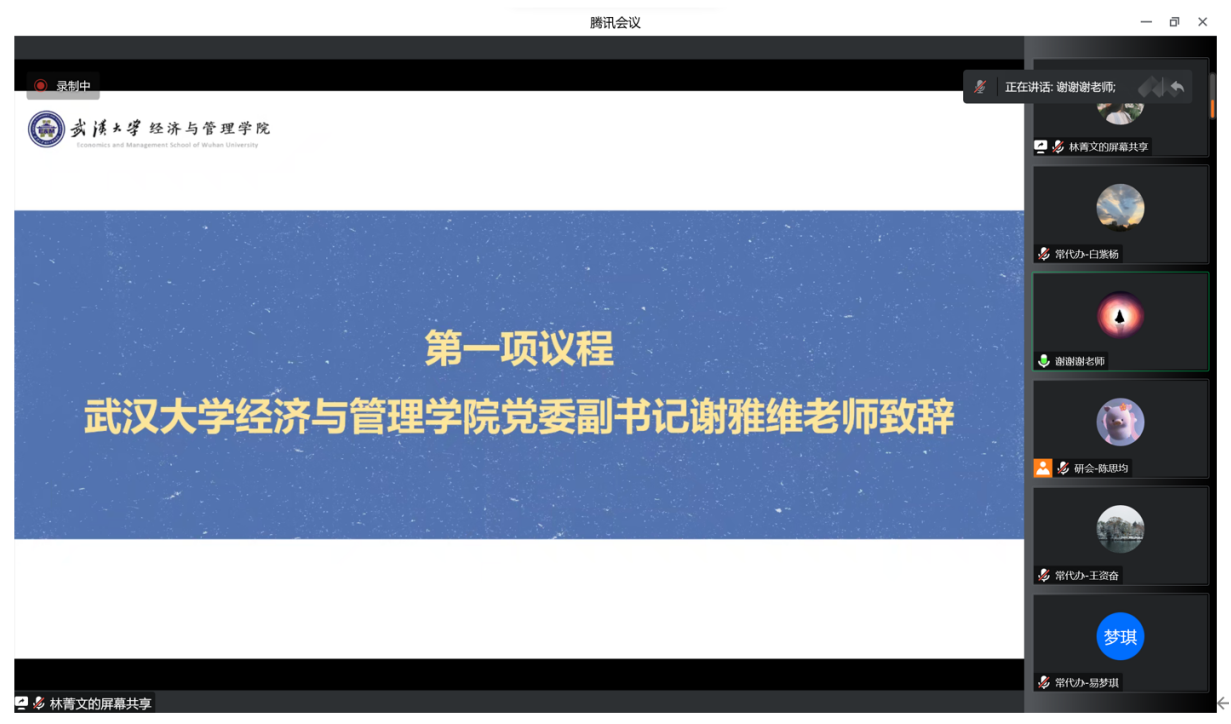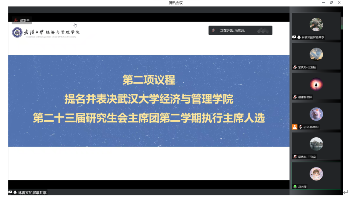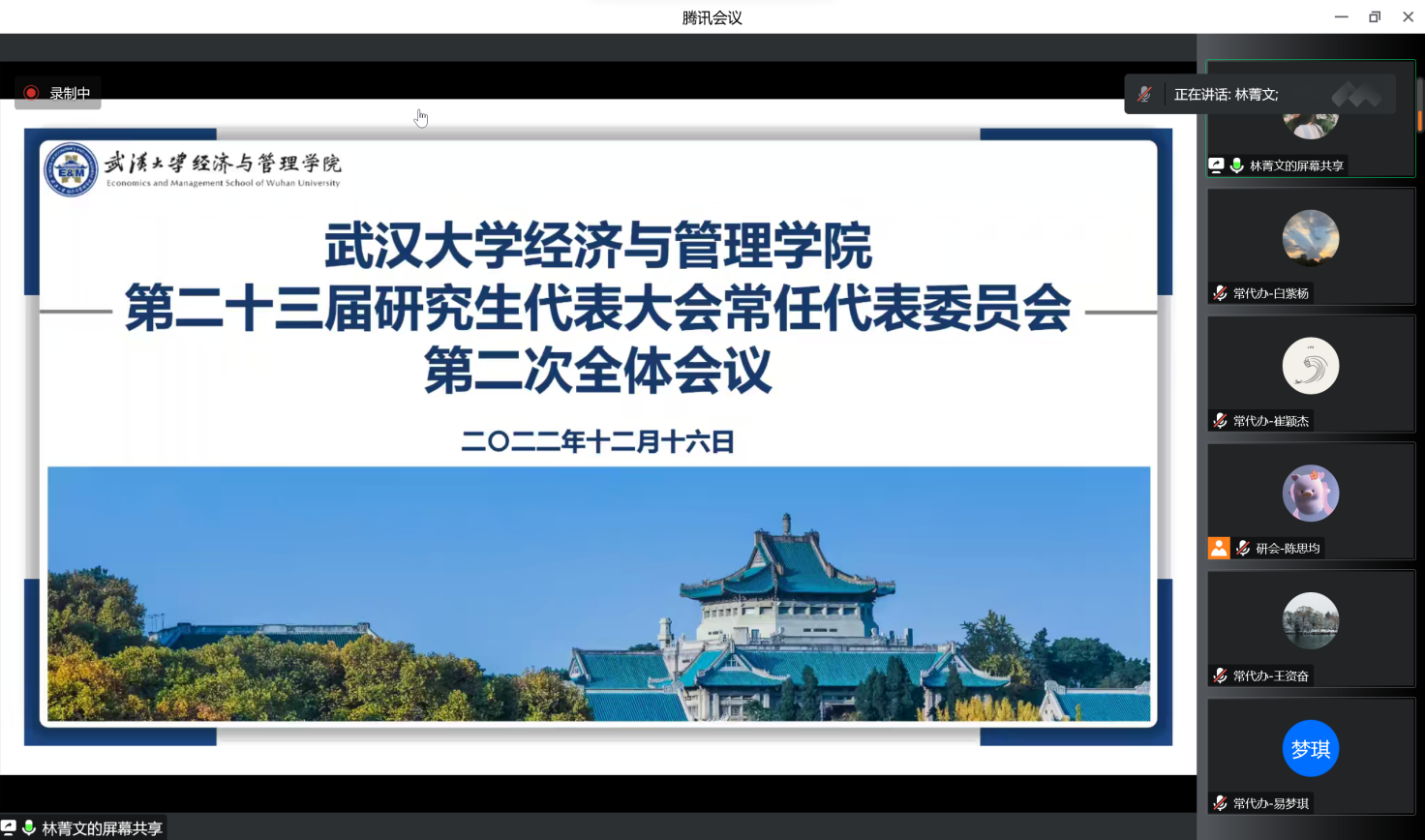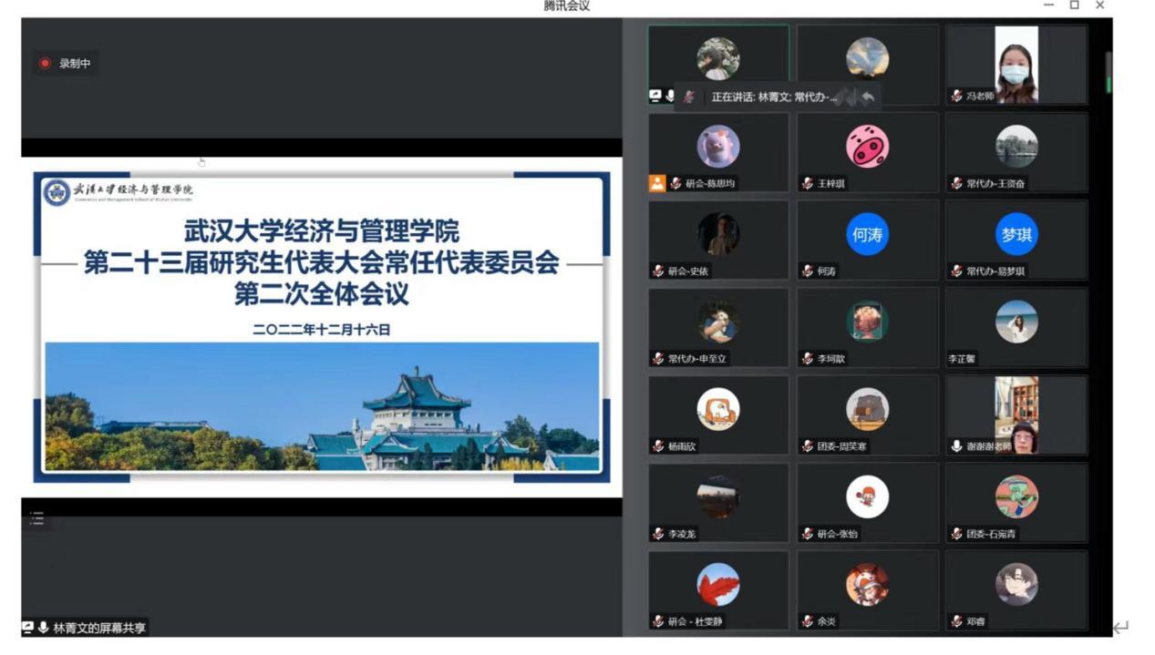 12月16日下午,威廉希尔第二十三届研究生代表大会常任代表委员会(以下简称常代会)第二次全体会议因疫情原因在腾讯会议线上举行,威廉希尔足球官网公司党委副书记谢雅维老师、威廉希尔研究生工作办公室主任周立超老师、威廉希尔团委副书记冯梦珂老师、威廉希尔团委副书记(员工)、部门(中心)负责人、威廉希尔第二十三届研究生会主席团成员、部门负责人、威廉希尔第二十三届研究生代表大会常任代表委员会全体委员、威廉希尔第二十三届研究生代表大会常任代表委员会办公室全体工作人员参与会议。