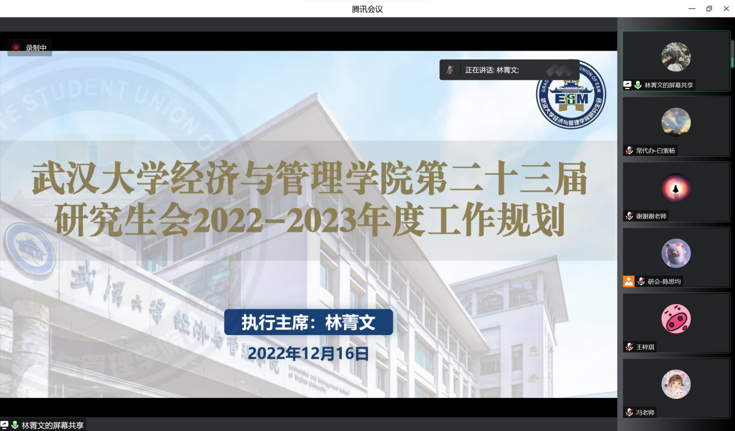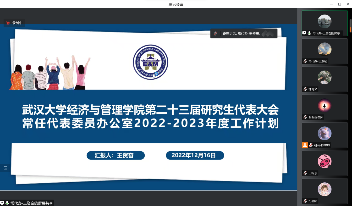 之后,会议审议并表决通过了威廉希尔第二十三届研究生会2022-2023年度工作规划。林菁文同学提出新一届研究生会对整体工作方向的计划与部署可归纳为以下五点:脚踏实地,落实基本任务;革新自我,抓好团队建设;服务同学,聚焦实际需求;联动院校,树立经管形象;团结同志,建功伟大时代。