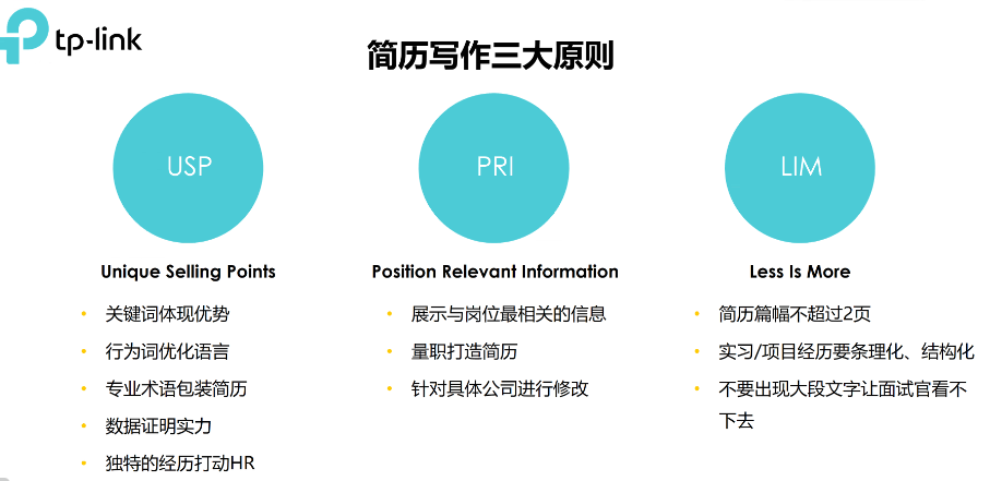 文老师讲到,TP-LINK产品工程师不限制具体专业投递,主要要求有良好的沟通能力、分析决策能力、团队执行力。