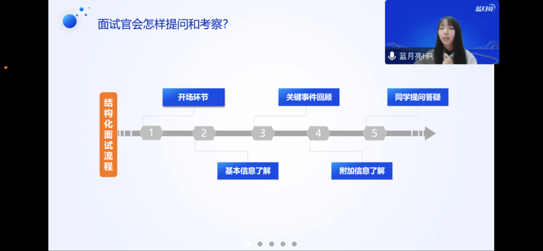 2.面试官会怎样提问和考察:梁老师从结构化面试流程来进行解答:开场环节主要是以自我介绍方式进行。关键事件回顾、基本信息了解、附加信息了解主要基于行为面试法:向面试官展示自己时可以讲述实习、科研、兼职、课程作业等多种多样的实践经历,并通过举例建议大家在回答问题时可以应用STAR法则来组织答案。在面试最后的提问答疑环节中,建议可以多关注未来的发展,多关注个人的成长和提升。